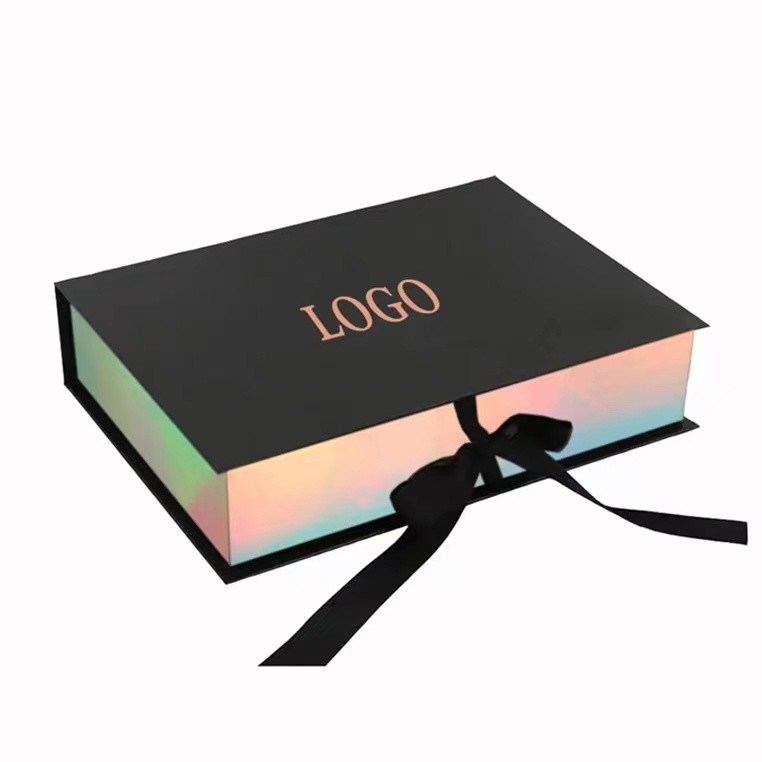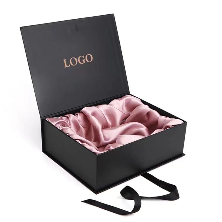 This is a black color gift box, we can print any logo on the top or the side view by hot stamping, which will be more luxury. In the