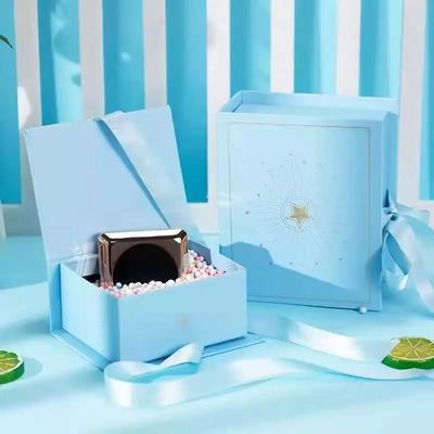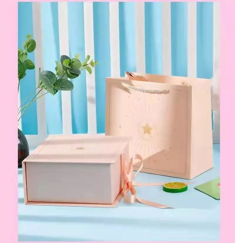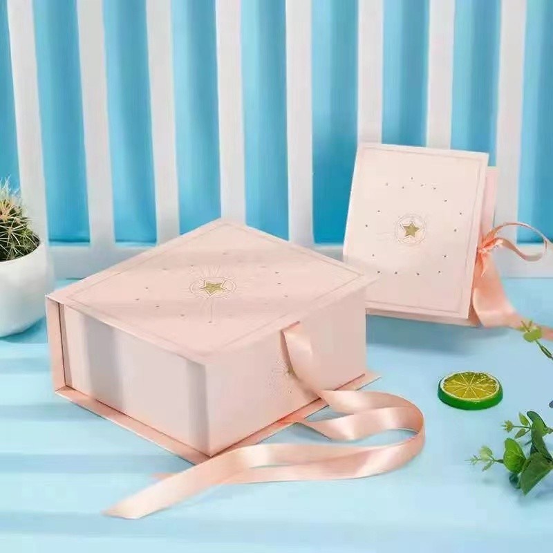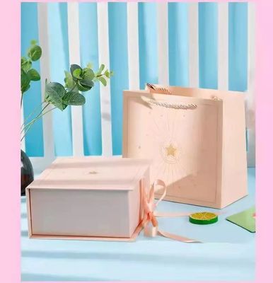 Pink Art Paper Paperboard Gift Boxes With Ribbon Print Logo By Hot Stamping For Gift Packaging