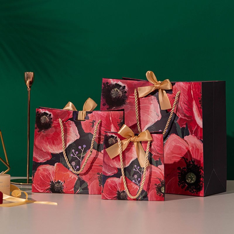 Red Art Paper Printed Paper Shopping Bag With Ribbon Handle For Shopping Gift Package